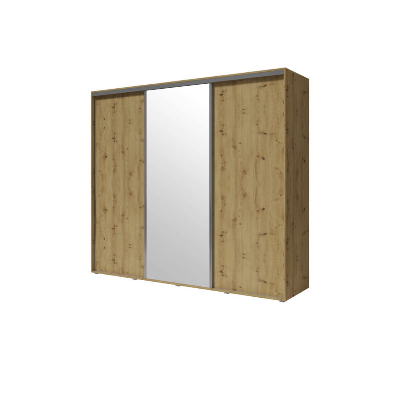 Szukasz połączenia elegancji, praktyczności i trwałości? Szafa przesuwna z lustrem GOLD to idealne rozwiązanie dla osób, które cenią sobie nowoczesny design i perfekcyjną organizację przestrzeni. Dzięki szerokości 255 cm, model GOLD należy do kategorii dużych szaf przesuwnych, które gwarantują sporą ilość miejsca do przechowywania. Centralne lustro na froncie nie tylko dodaje elegancji, ale także optycznie powiększa pomieszczenie, doświetlając je naturalnym światłem. Przestronne półki i przegrody doskonale nadają się do przechowywania złożonej odzieży, pościeli czy sezonowych dodatków, a drążki na ubrania umożliwiają wygodne rozmieszczenie rzeczy wymagających powieszenia, takich jak płaszcze, sukienki czy garnitury. Szafa przesuwna z lustrem sprawdzi się zarówno w minimalistycznych wnętrzach, jak i w przestrzeniach o bardziej klasycznym lub industrialnym charakterze.
