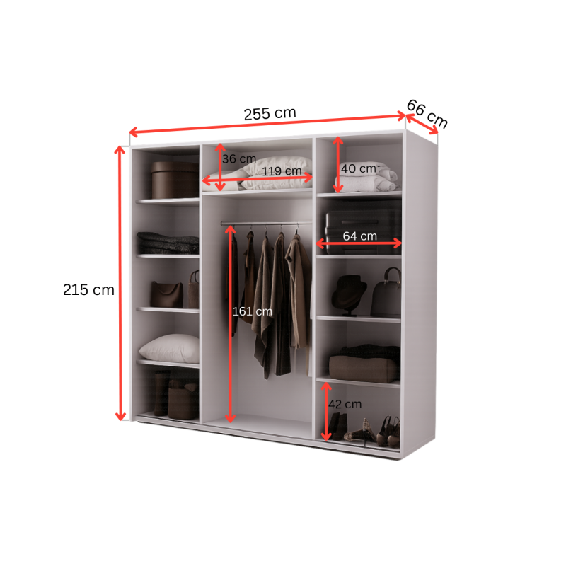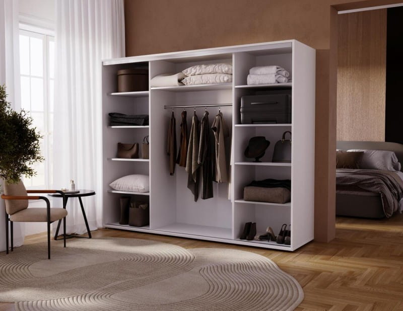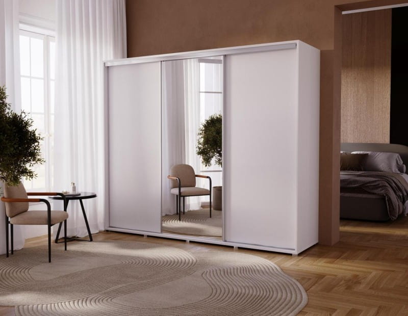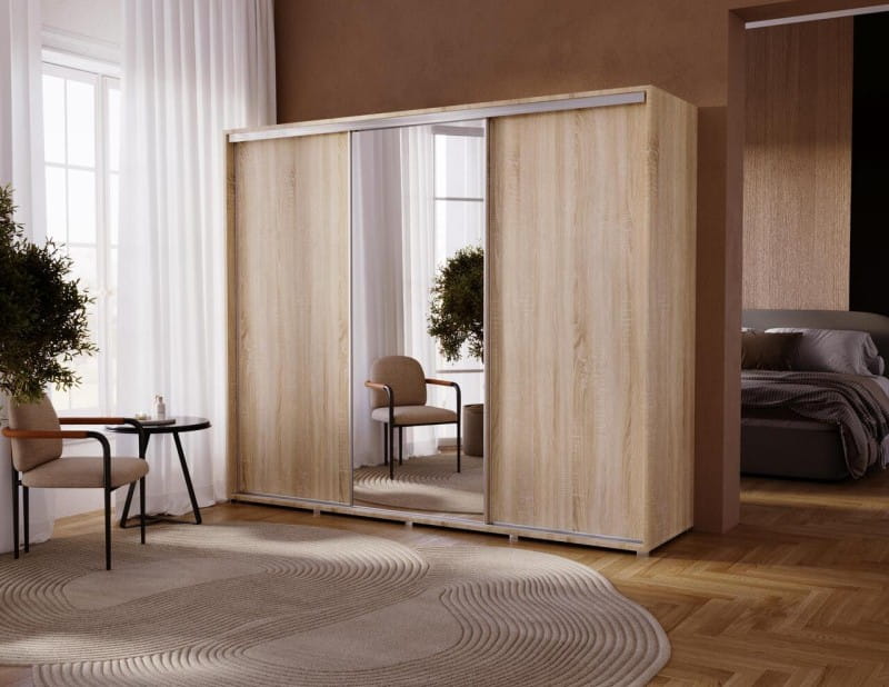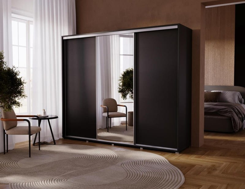 Szukasz nowoczesnej, pojemnej szafy, która nie tylko pomieści całą Twoją garderobę, ale też optycznie powiększy wnętrze i nada mu charakteru? Szafa przesuwna 255 cm z lustrem to doskonały wybór.